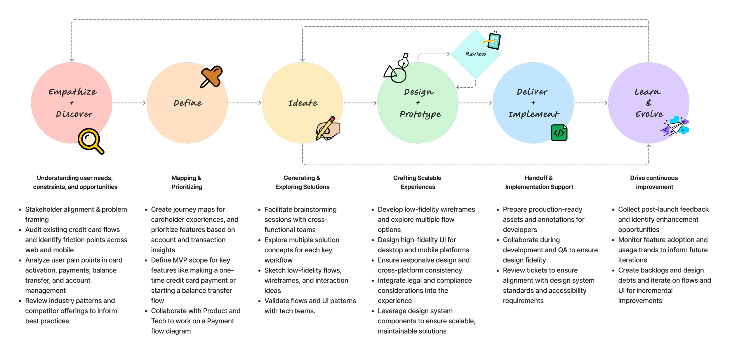 This framework was used flexibly across multiple credit card features that I worked on, scaling depth based on scope and complexity while maintaining a consistent, user-centered approach within an Agile delivery model.